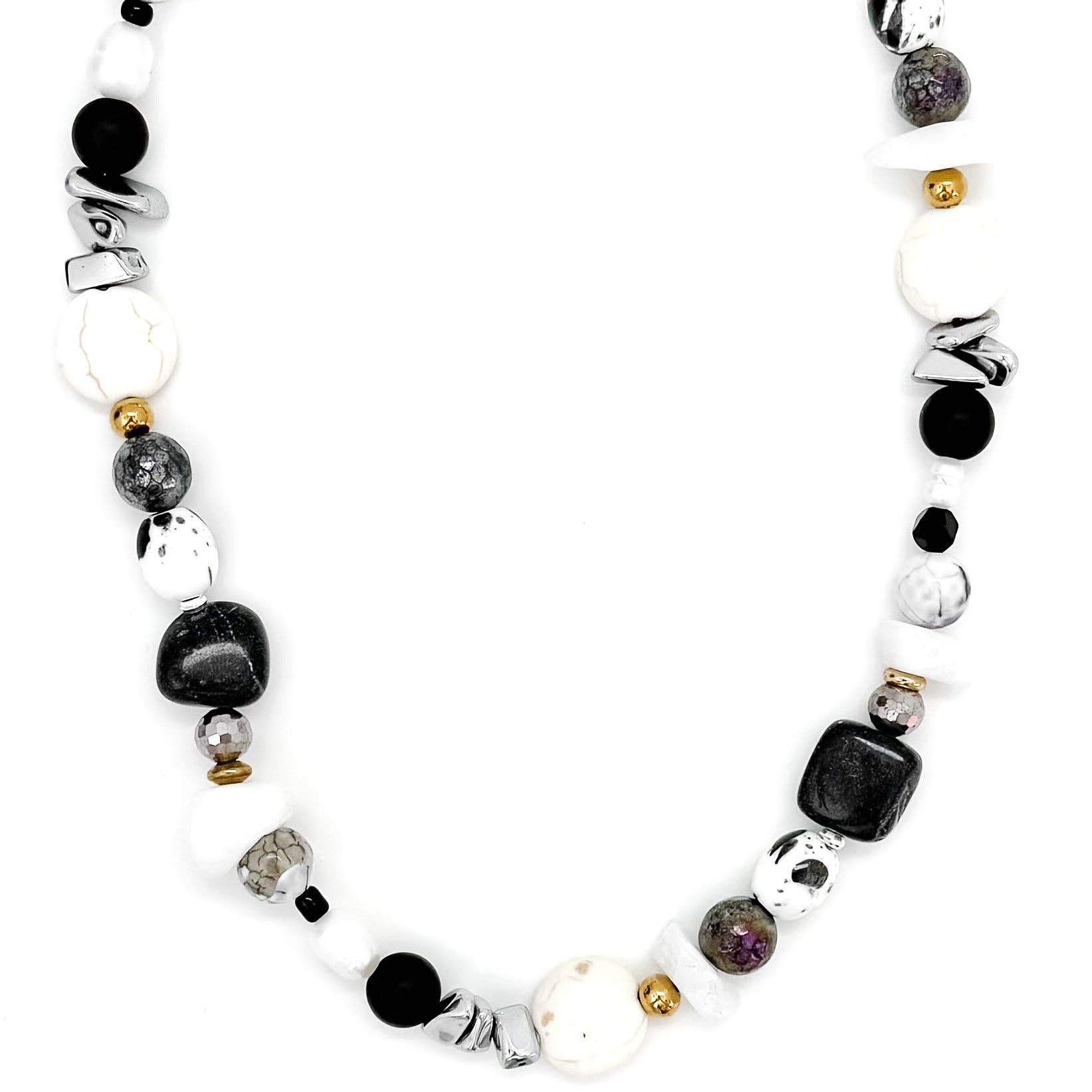 This neutral beaded necklace is hand strung with a unique mix of semi-precious and acrylic beads, making every piece one of a kind. Designed to be lightweight and comfortable, it’s finished with an extender for easy layering and customizable length.