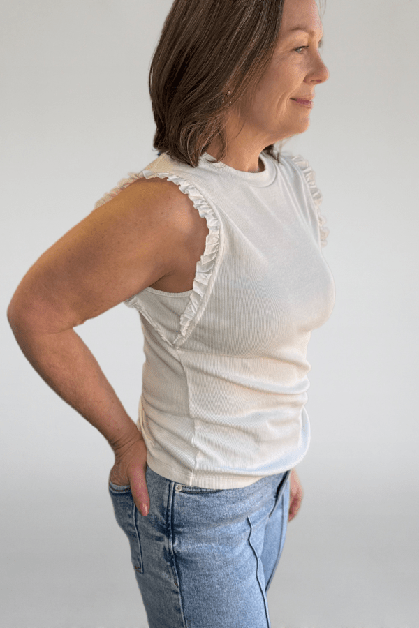 Enhance Your Wardrobe With This Must-Have Piece. The Bridget Ruffle Top by Dear John Denim features a classic crew neck and sleeveless design that makes it an ideal choice for layering or wearing alone. The delicate ruffle detailing adds a sophisticated flair, making it a versatile addition to any outfit. Perfect for Any Setting, this top transitions effortlessly from day to night, ensuring you look chic in every scenario.