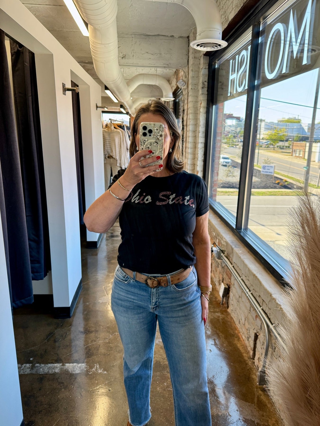 Step up your game day style with the Beaded Ohio State Tee, a perfect blend of comfort and team spirit. Imagine walking into the stadium or your favorite Buckeye watch party wearing this unique tee, adorned with eye-catching red and silver beads that spell out “Ohio State.” This t-shirt isn't just clothing—it’s a bold statement of your loyalty to the Buckeyes. Designed for fans who want to stand out, this tee lets you celebrate every touchdown in style and comfort.