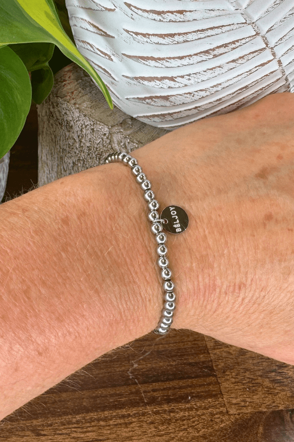 Designed by Béljoy and made in the USA, the Billy Silver Small Bead Bracelet features hypoallergenic, 18K plated stainless steel beads on a 7.25” stretch cord. Waterproof, tarnish-resistant, and ideal for sensitive skin, it’s built to last while offering a delicate, polished style that’s trending in everyday jewelry.