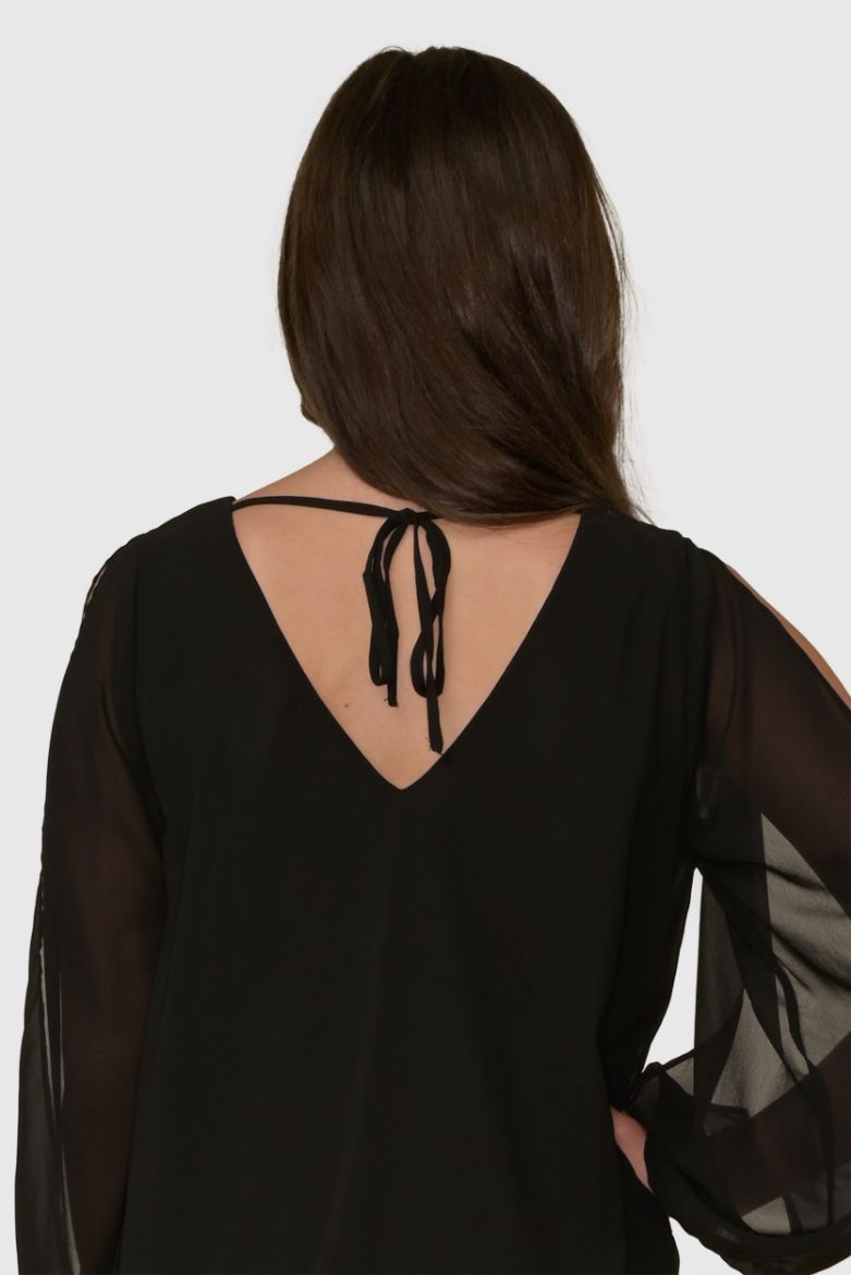 This exquisite piece is perfect for those seeking both style and comfort. The lightweight chiffon fabric drapes beautifully, ensuring a flattering fit for all body types. Its sheer balloon sleeves add a dramatic yet delicate flair, perfect for any event from a casual brunch to a formal gathering. Emphasizing both timeless style and versatility, the self-tie V-back ensures a perfect fit, catering to your unique body shape.