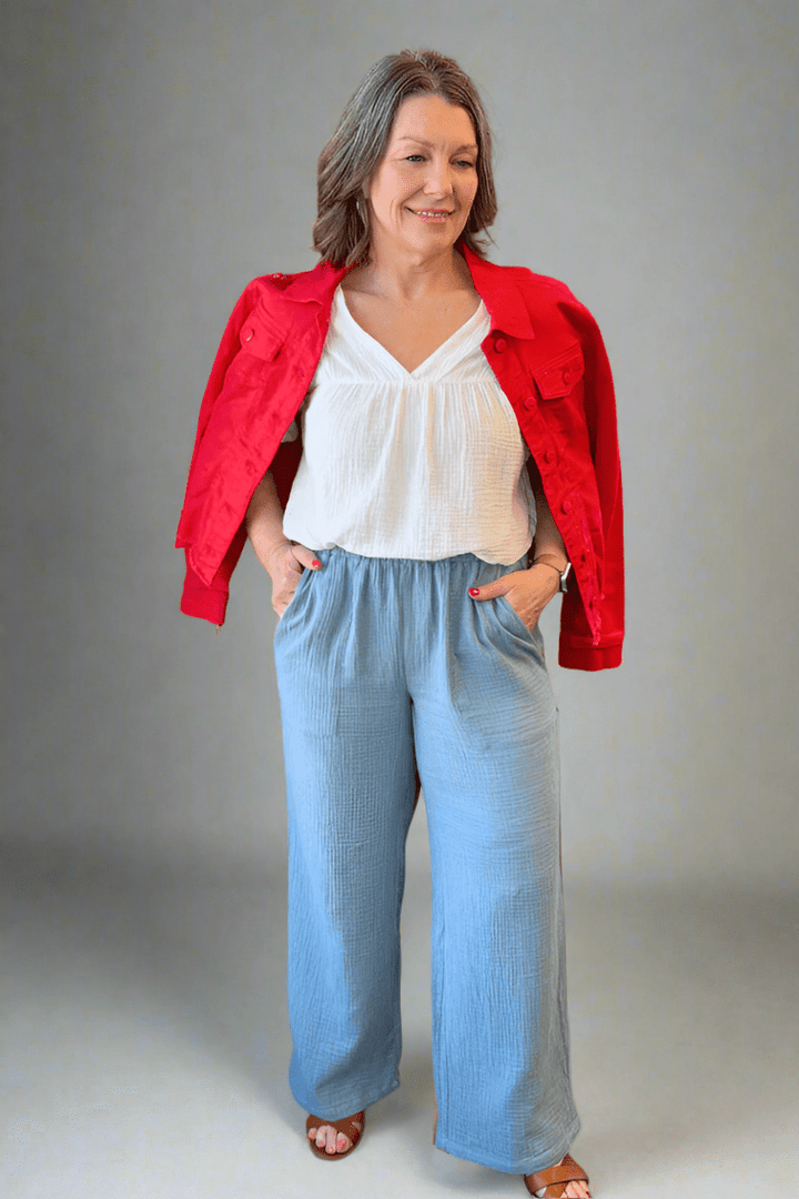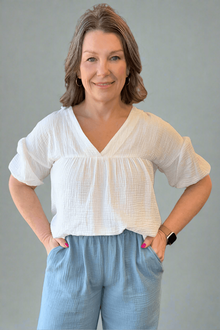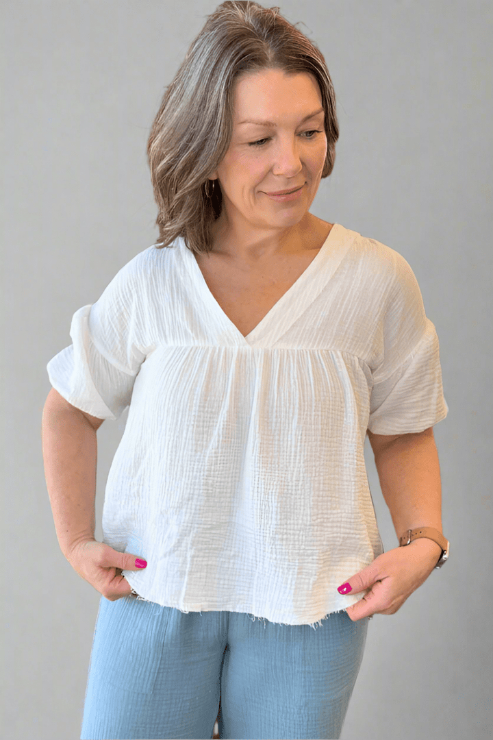 Feel the breeze of effortless elegance with our Cotton Gauze V-Neck Puff Top, designed to elevate your everyday wardrobe with a touch of sophistication. This top blends the casual comfort of cotton with the chic appeal of puff sleeves, creating a look that’s as stylish as it is comfortable. Perfect for those sunny days or casual evenings out, its lightweight gauze fabric ensures you stay cool while looking distinctly fashionable.