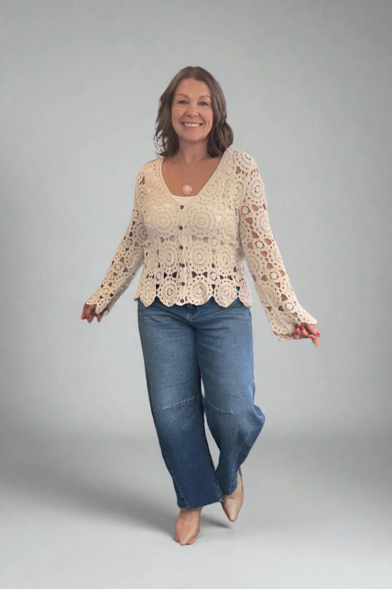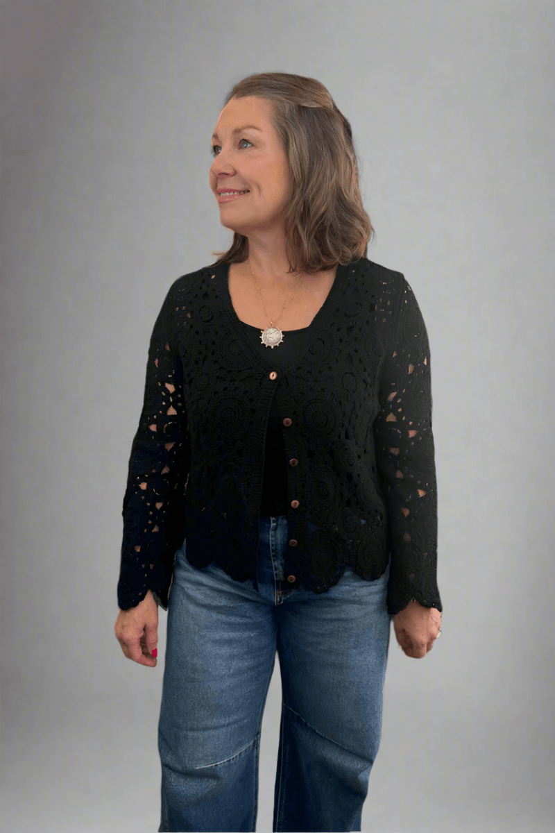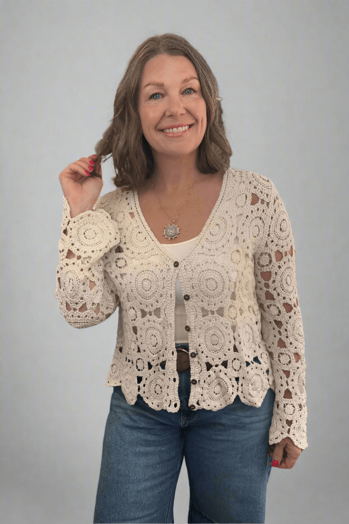 There’s something effortlessly charming about a sweater that feels handcrafted and looks refined. This crochet button front cardigan gives you that cozy, vintage-inspired vibe with modern ease. With its circle-patterned crochet design, flattering v-neckline, and lightweight cotton feel, it’s perfect for layering over tanks, camis, or even dresses. Whether you're lounging at home or heading out for a casual day, this cardigan adds comfort and character to your outfit.