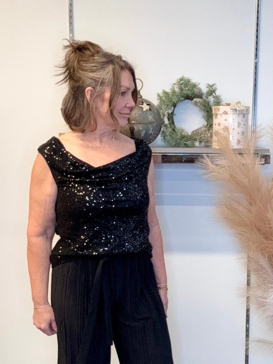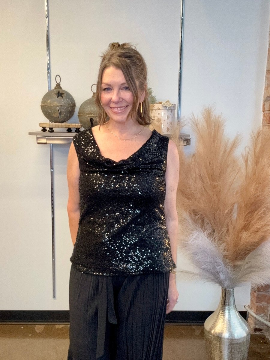 Embrace a touch of luxury with our Sequin Drape Neck Tank Top, designed to catch the eye and elevate any ensemble. Whether you're dressing up for a special event or adding sparkle to your everyday look, this tank top ensures you do it with style and grace. The elegant drape neck enhances your silhouette, offering a sophisticated flair that transitions seamlessly from day to night.