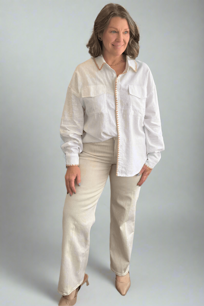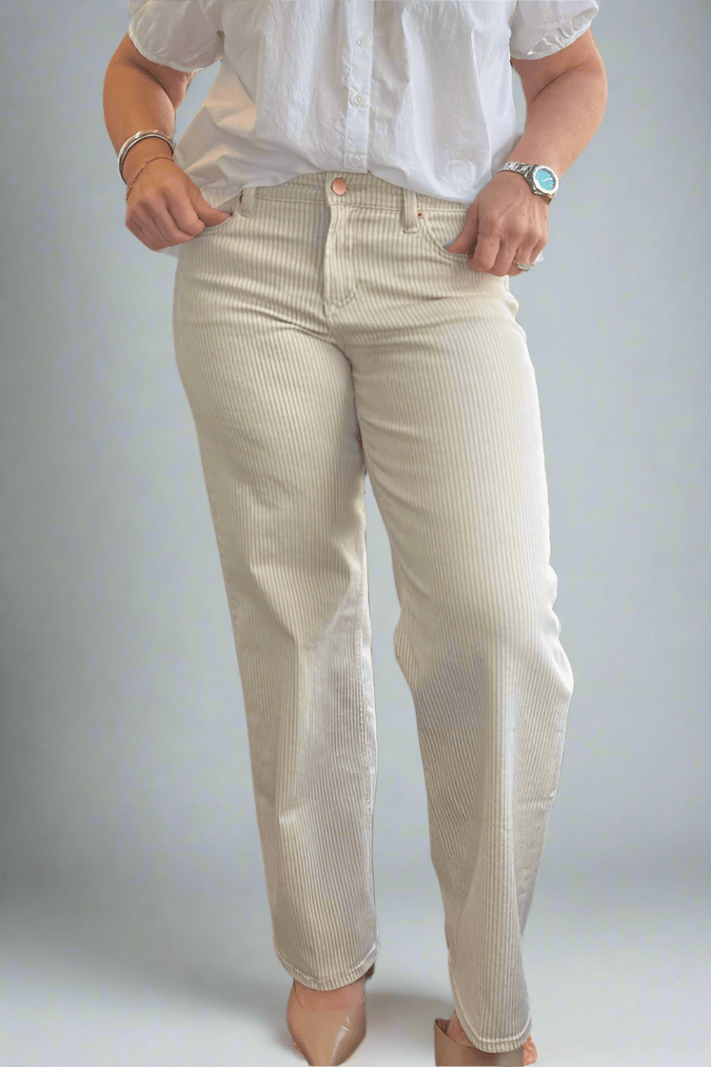 Discover a new level of comfort and sophistication with the Taylor Novelty Straight Leg Jean in Sand Stripe. This pant seamlessly blends classic tailoring with a modern twist, making it a must-have addition to your closet. Imagine the effortless elegance and confidence you’ll exude every time you wear this flattering silhouette, perfect for any occasion, whether casual or dressy. Women's straight leg striped jeans.
