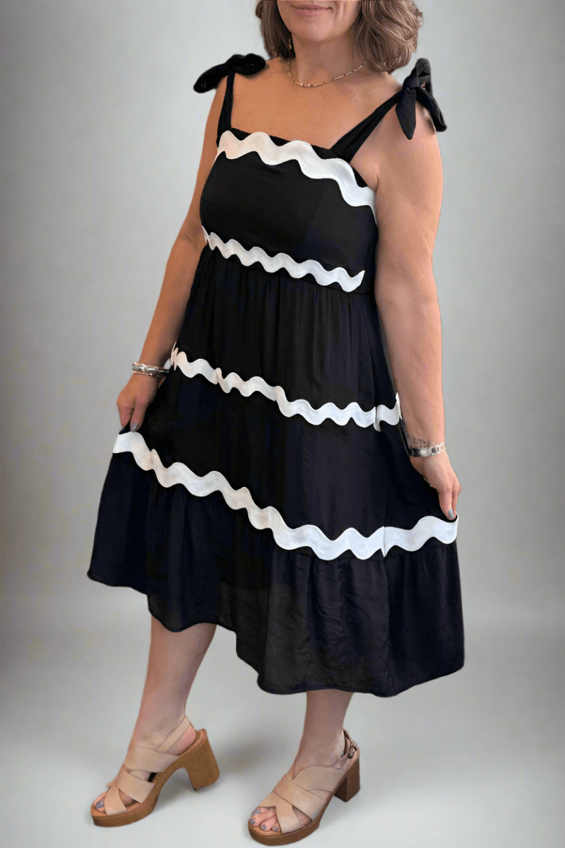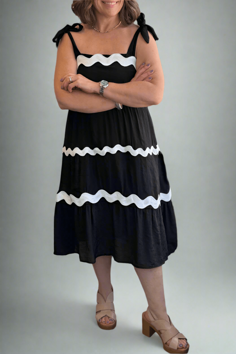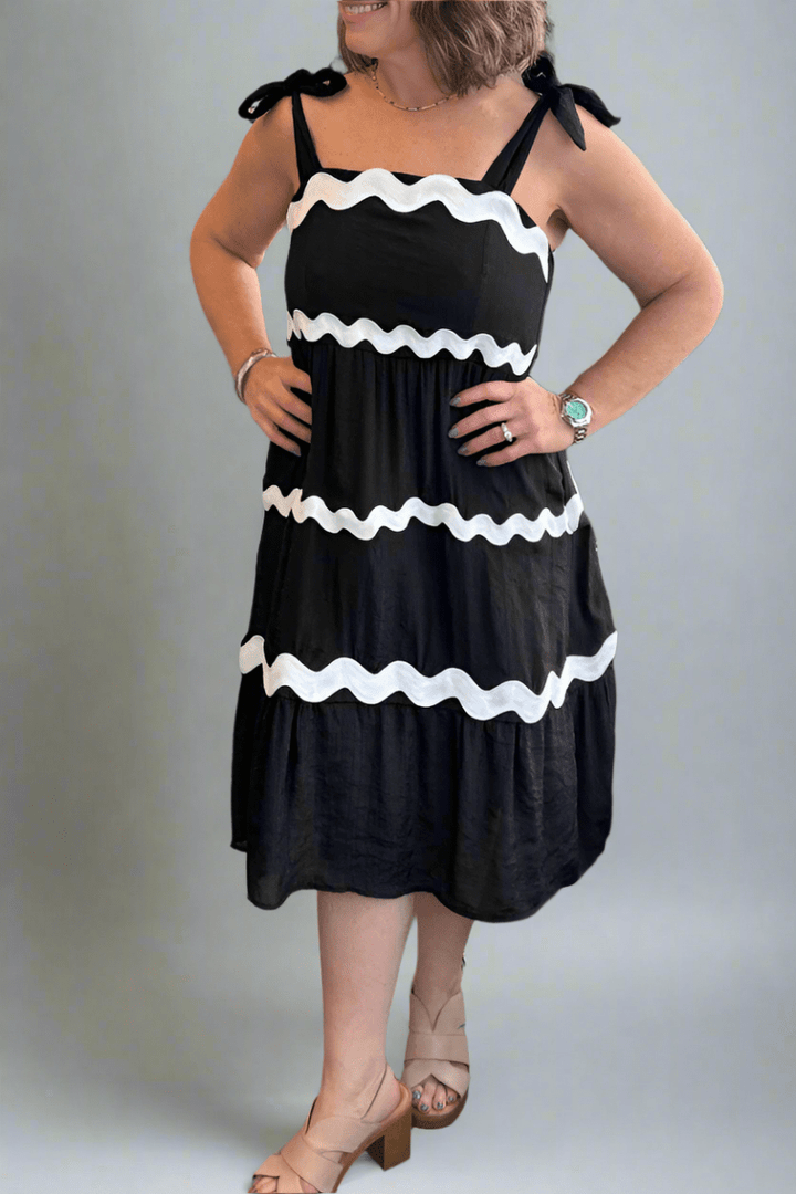 Step into effortless elegance with this Tissue Faille Tie Strap Ric Rac Trim Midi Dress. The moment you slip it on, you’ll feel its light and flowy nature—a soft breeze of confidence that comes from wearing a dress that truly flatters. Its romantic tiered design and playful ric rac trim add a touch of whimsy, perfect for making memories on sunny days and summer nights. Let the adjustable tie straps and smocked bodice ensure the perfect fit as you move freely and comfortably.